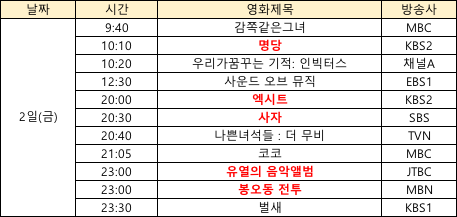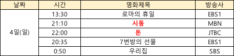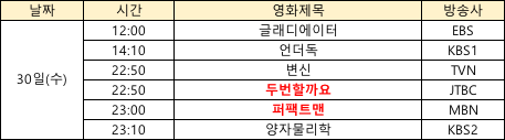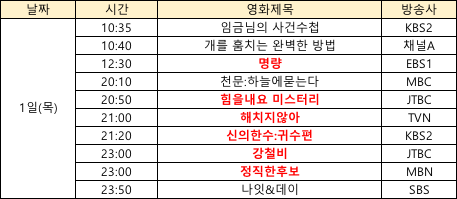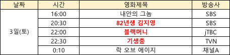 상기 영화 편성은 방송사의 사정에 따라 변경될 수 있으며, 추가로 들어오는 정보는 계속해서 업데이트 해드릴게요:)