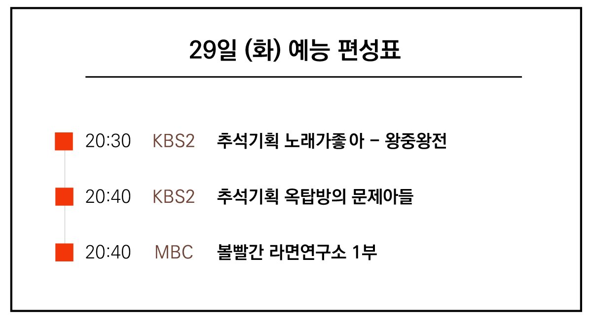 본격 연휴가 시작하기전 화요일 저녁에 추석기획 노래가좋아, 옥탑방의 문제아들, 볼빨간 라면 연구소 1부가 방영됩니다.