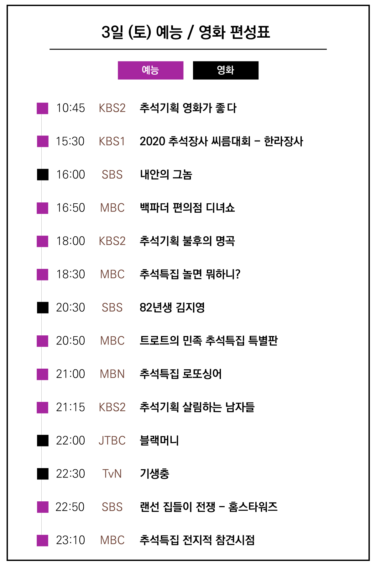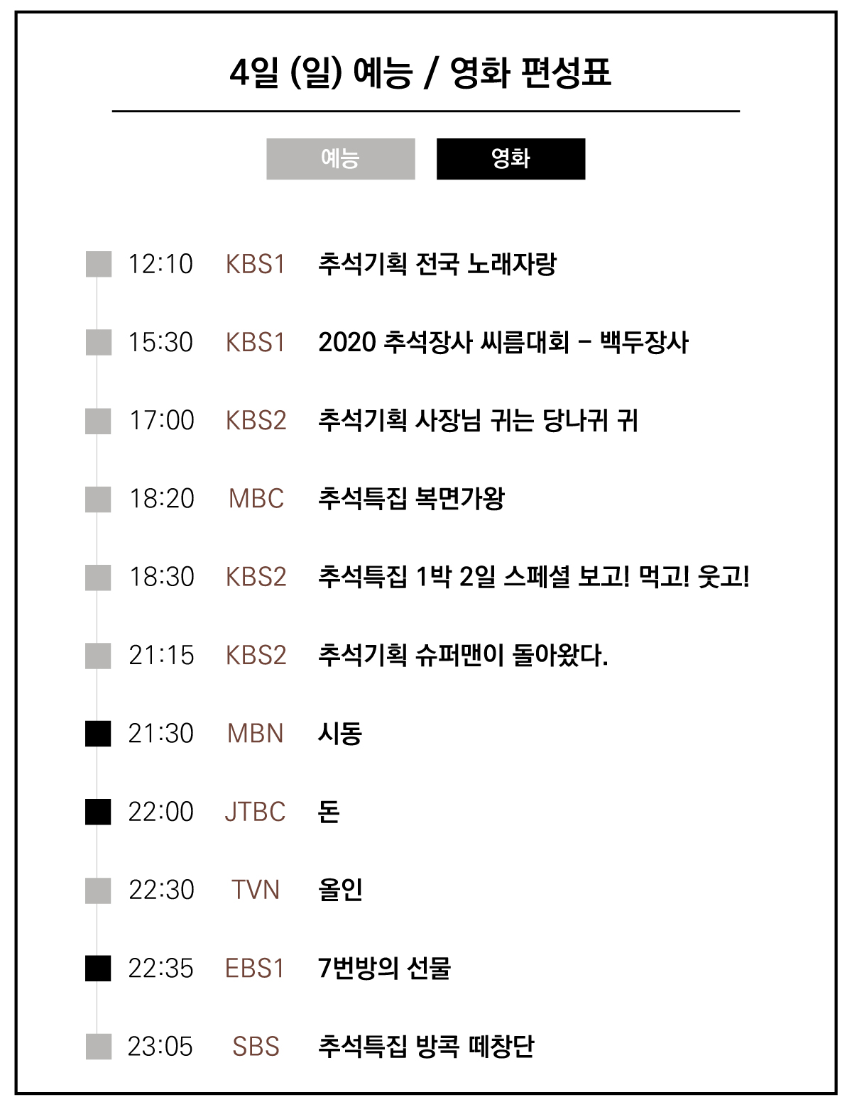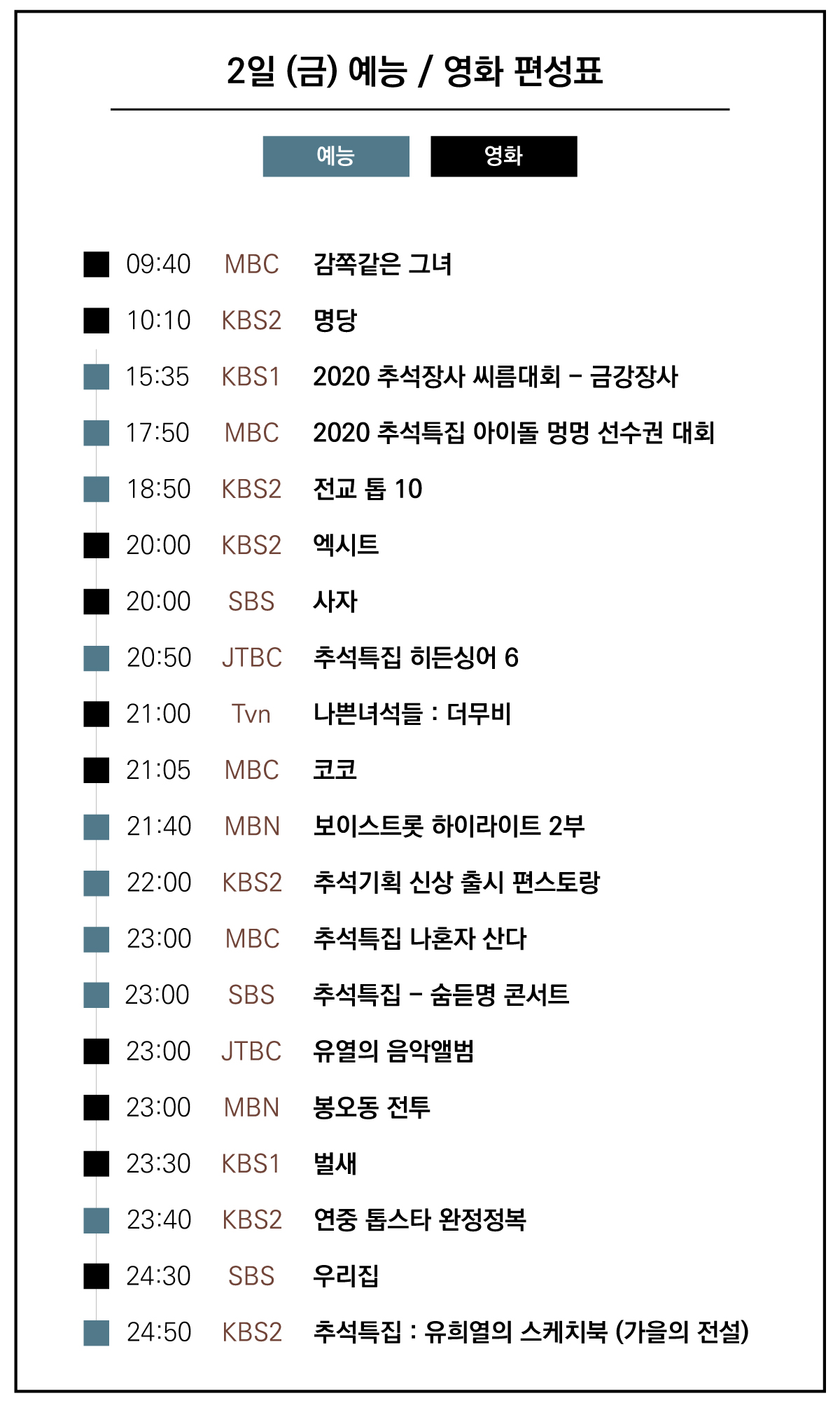 | 2020년 추석 특선영화 편성표 총정리 :: 표로 한눈에 모아보기! (0) | 2020.09.28 |