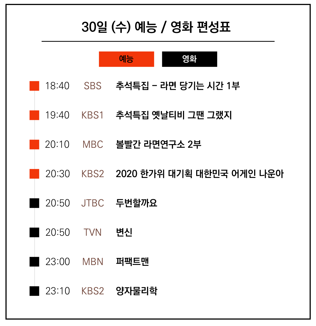 2020년 9월 30일 편성표 (수)