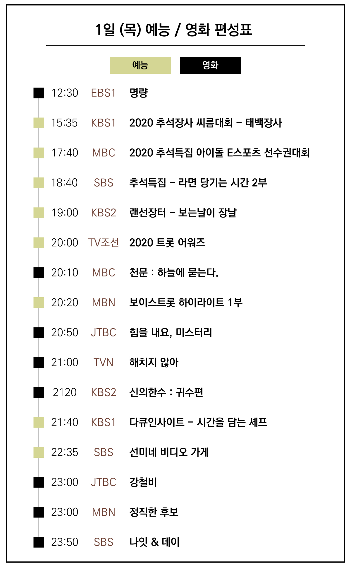 추석 예능, 추석 영화 편성표 한눈에 시간대별 정리 (공중파/케이블)