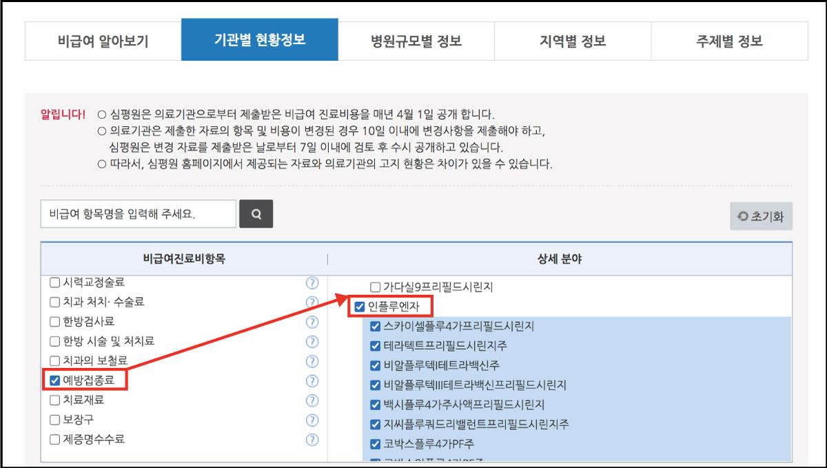 비급여 진료비 항목 중 예방접종료 > 인플루엔자 상세분야 체크