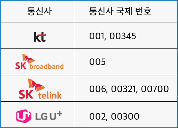 KT국제전화 001, 00345 SK브로드밴드는 005, sk텔링크는 006, 00321, 00700. LG유플러스는 002, 00300 입니다.