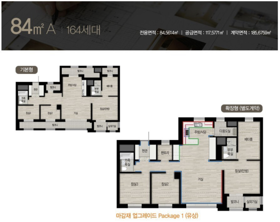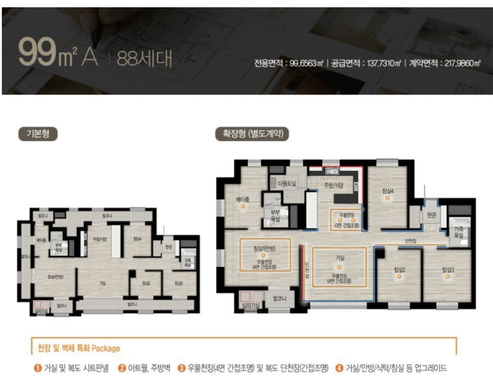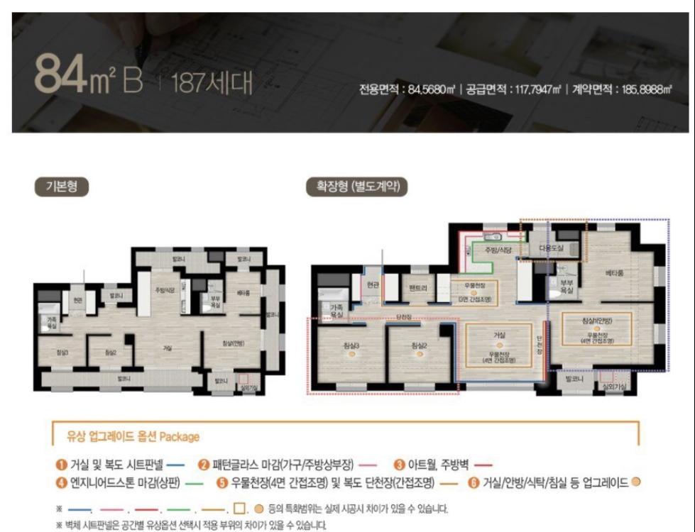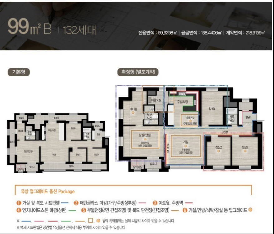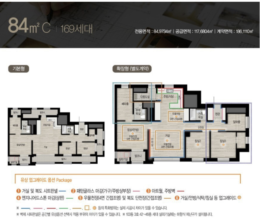 84㎡형 3가지 타입과 99㎡ 2가지 평형이며, 옵션은 추후 별도 계약해야합니다.