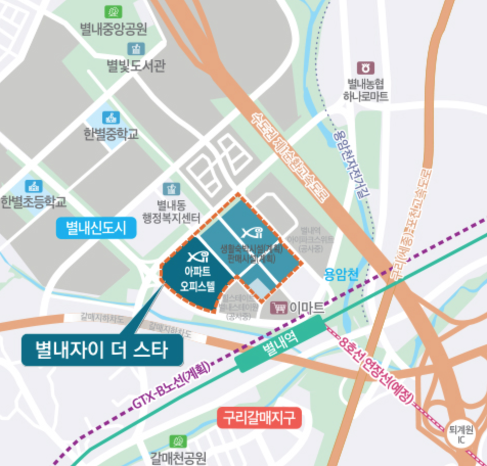 별내 자이더스타는 남양주시에 위치한 별내택지개발 지구입니다. 서울 강북과 인접한 곳으로 중랑구와 매우 인접해 있는것이 특징입니다.