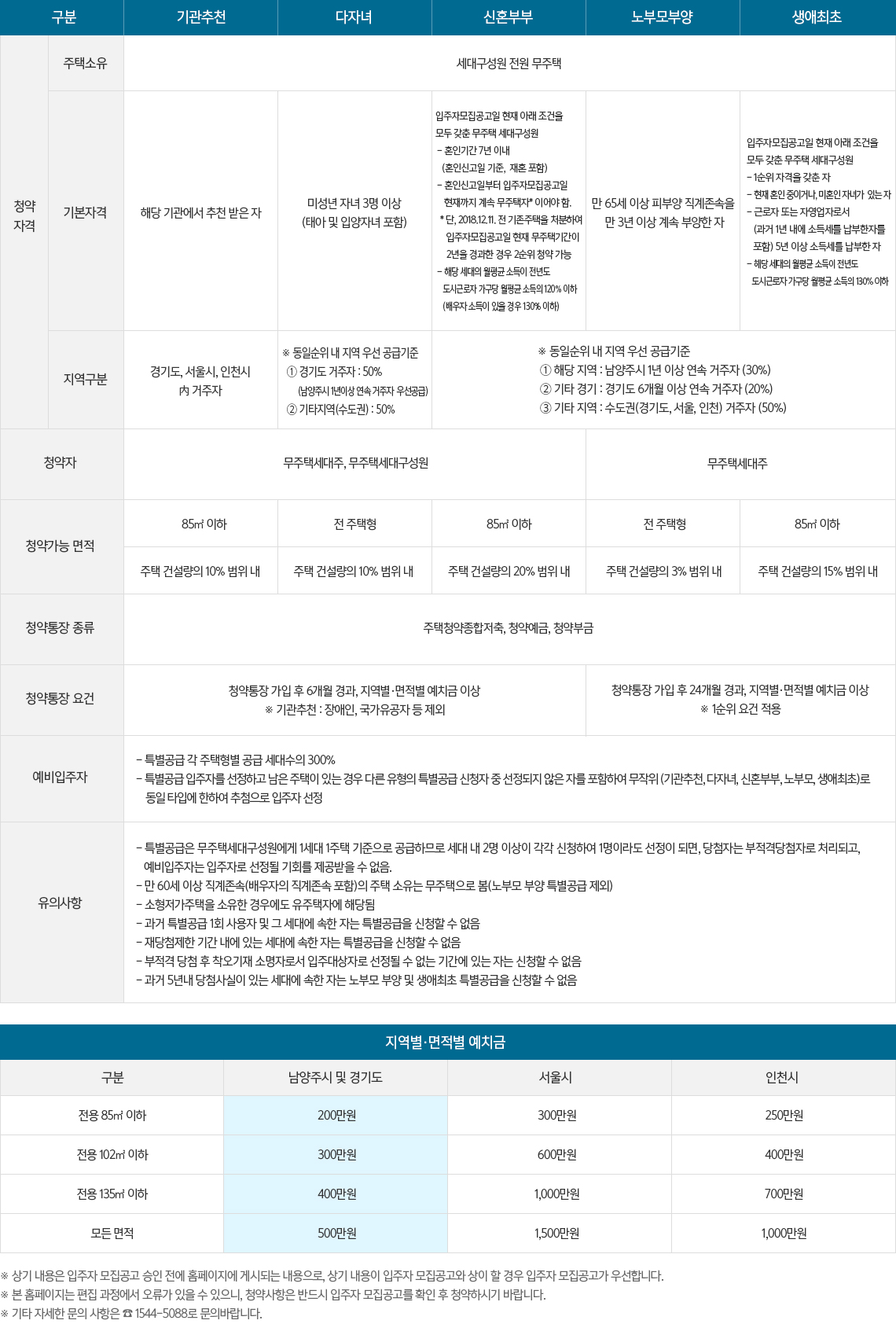 | 특별 공급 청약 | 기관추천, 다자녀, 신혼부부, 노부모부양, 생애최초 |