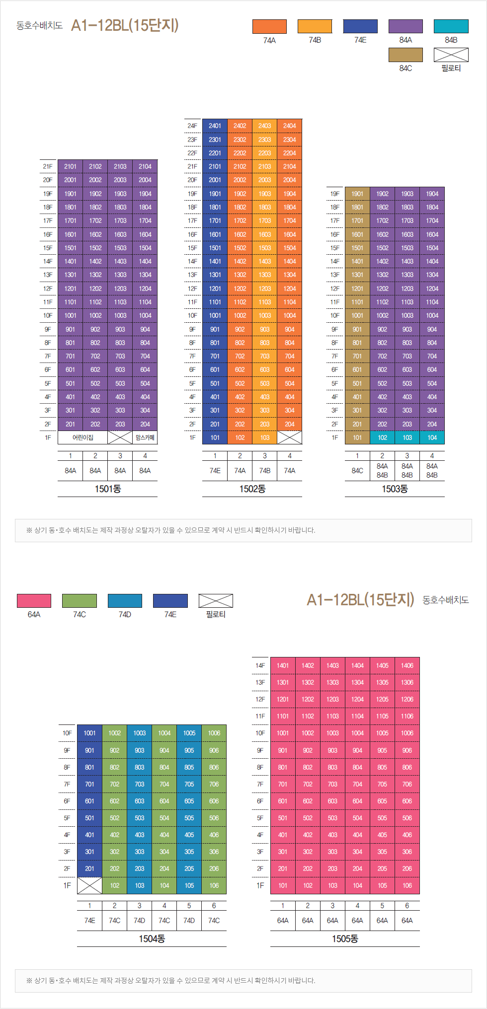 5블럭과 달리 평형대별로 저층부터 고층까지 고르게 분포 되어 있어서 층수에 예민하신 분들은 좀더 넓은 선택의 폭이지 않을까 싶습니다. 또한 12블럭은 모든세대가 정남향 입니다.