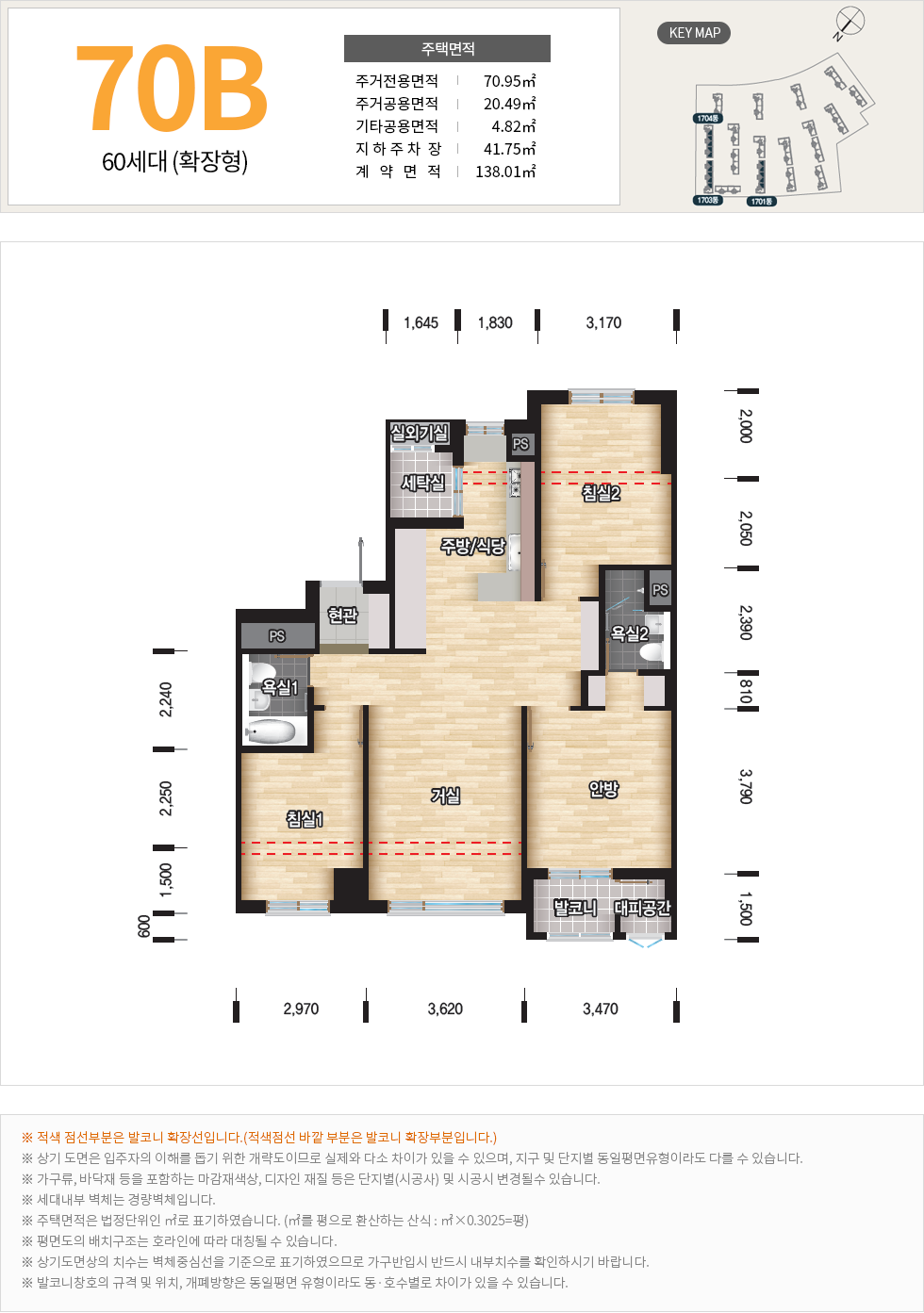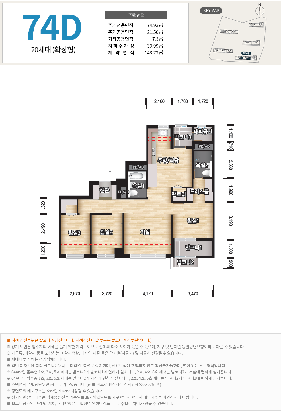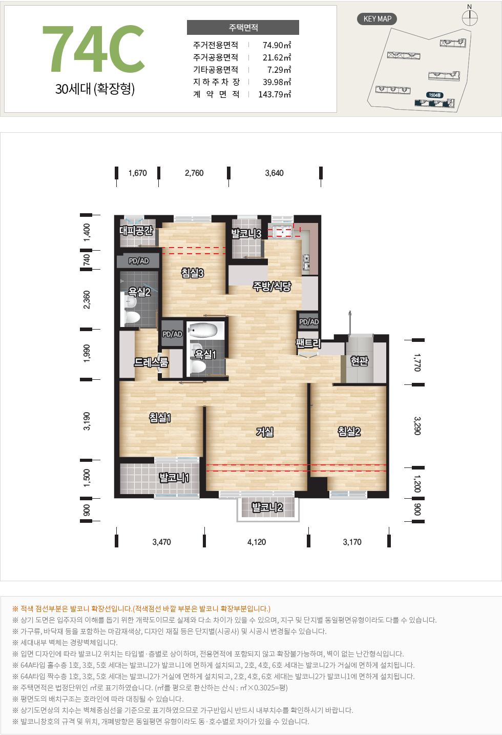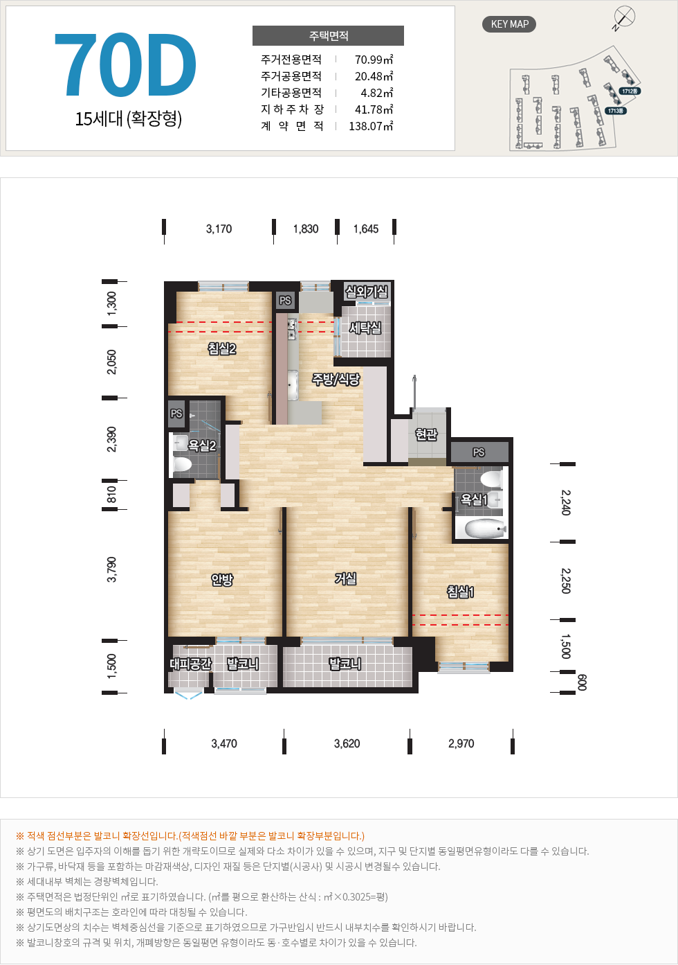 제일 작은 평면의 66㎡은 일반적인 구조라 크게 호불호가 있지는 않습니다. 다만 70㎡은 타입별로 약간 특이한 점이 있는데요. 이는 오픈 발코니 입니다. 70C, 70D에만 있는 이 오픈발코니는, 확장이 불가능하고 천장이 없는 오픈된 발코니 입니다. 쉽게 생각해서 콘도에 놀러가셨을때 앞에 있는 발코니라고 보시면 됩니다.