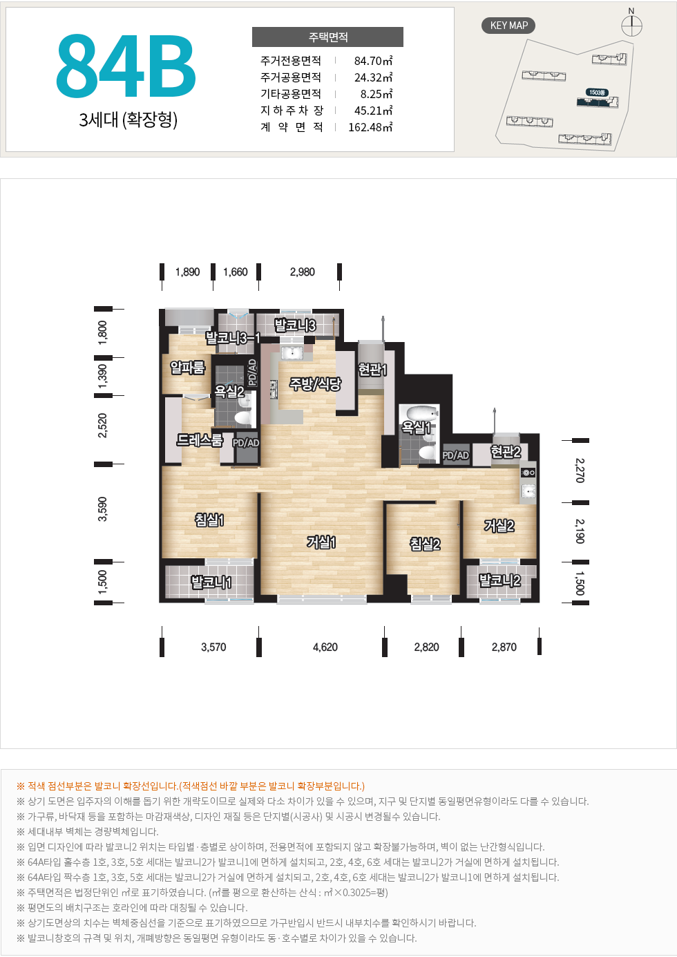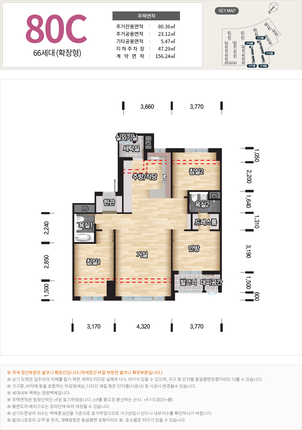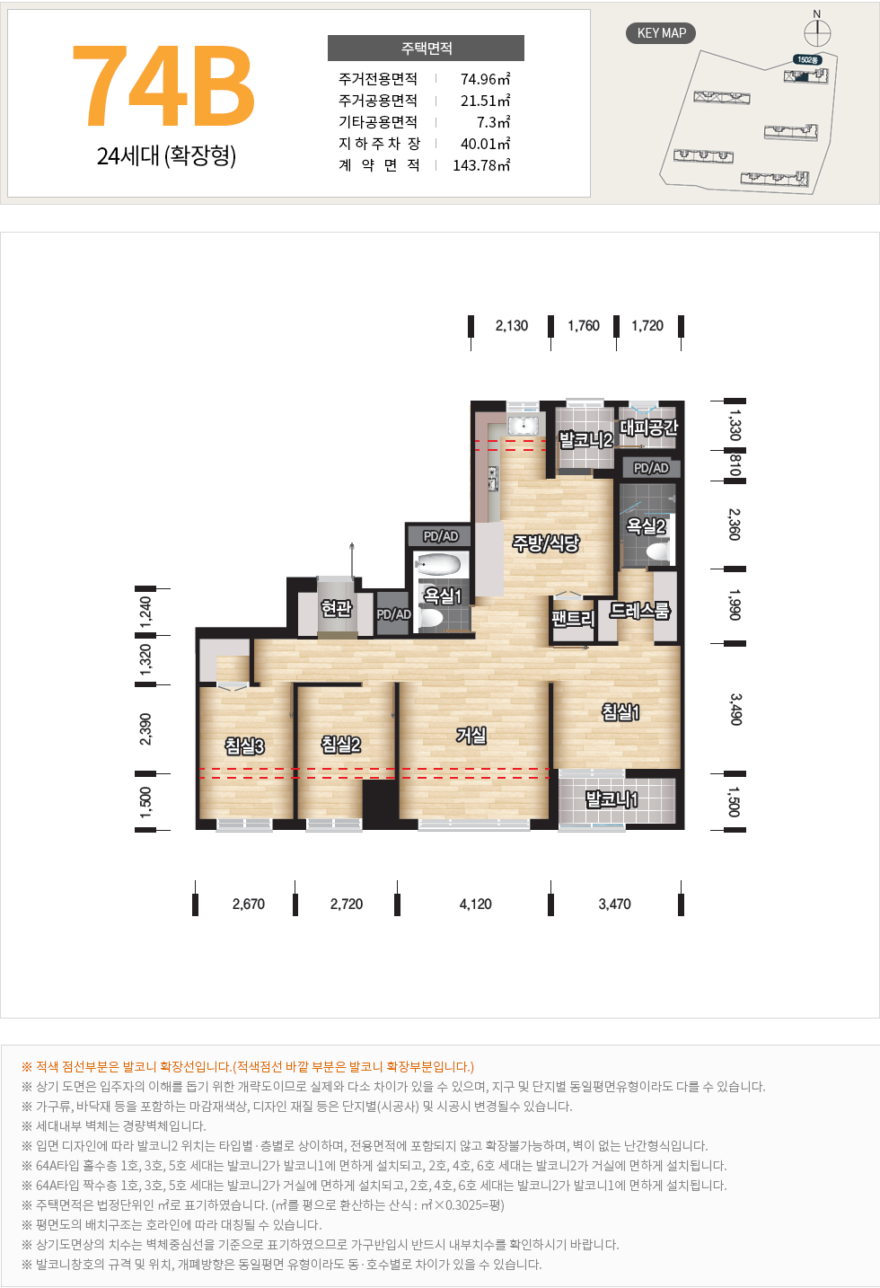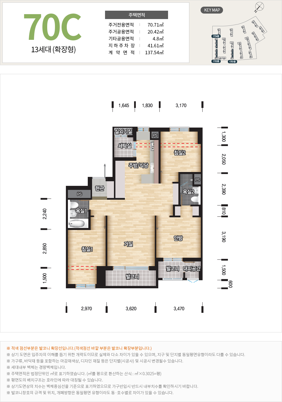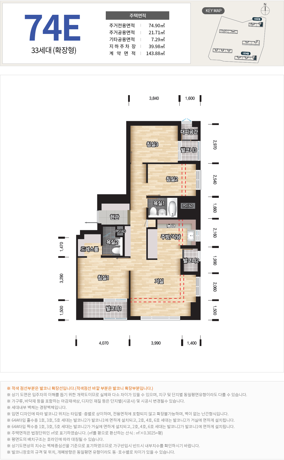 제일 작은 평면의 66㎡은 일반적인 구조라 크게 호불호가 있지는 않습니다. 다만 70㎡은 타입별로 약간 특이한 점이 있는데요. 이는 오픈 발코니 입니다. 70C, 70D에만 있는 이 오픈발코니는, 확장이 불가능하고 천장이 없는 오픈된 발코니 입니다. 쉽게 생각해서 콘도에 놀러가셨을때 앞에 있는 발코니라고 보시면 됩니다.