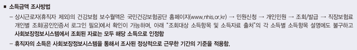 - 세대원 소득 모두 산정됩니다. 부모님, 처남과 같이 거주할경우 합산.