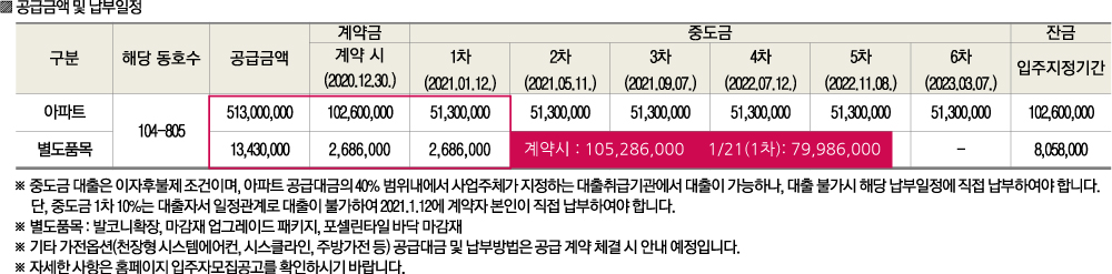 공급금액은 513.000.000원, 옵션비용 13.430.000원이며 계약금, 1차 중도금은 자납하여야 합니다