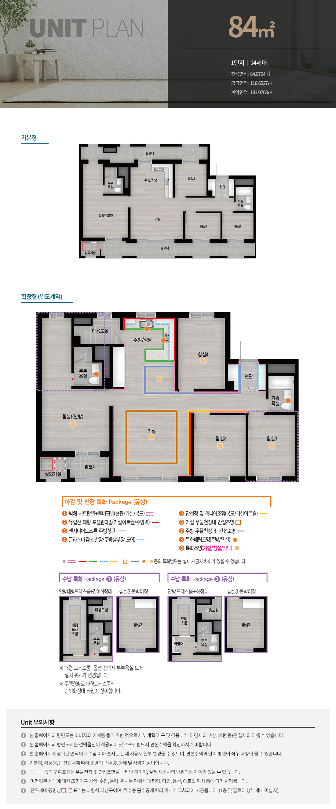 A, B타입 모두 판상형으로 구성되어 있습니다. 또한 안방의 대형드레스룸 옵션 선택이 가능하여 수납에 용이해 보입니다.