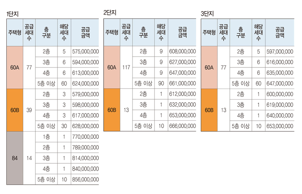 단지별, 평형별 분양가 표를 확인하시면 최저 금액이 약 5억7천5백 최고 금액이 8억 5천 6백으로 형성되어 있습니다. 언뜻 보면 비싸보이지 않을 수 있지만, 평형대가 작다는 것을 유념 하셔야 합니다.