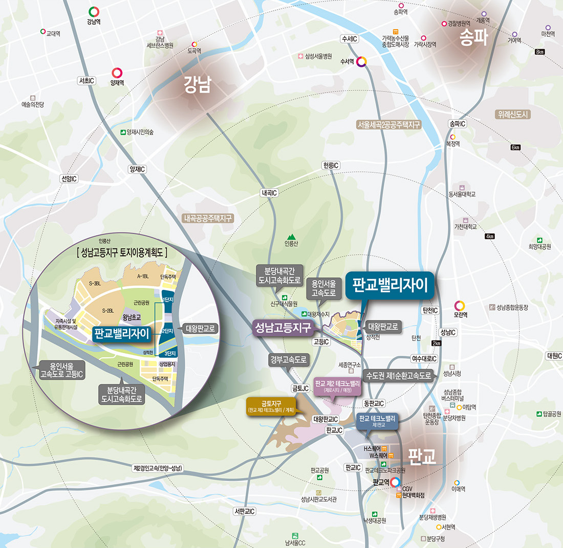 판교밸리자이는 동쪽으로는 성남, 북쪽으로는 강남, 남쪽으로는 판교에 제일 근접해 있는 위치입니다. 용인서울 고속도로와 분당내곡간도시고속화도로, 수도권 제1순환 고속도로와 인접해 있어서 교통의 편의가 매우 좋습니다.