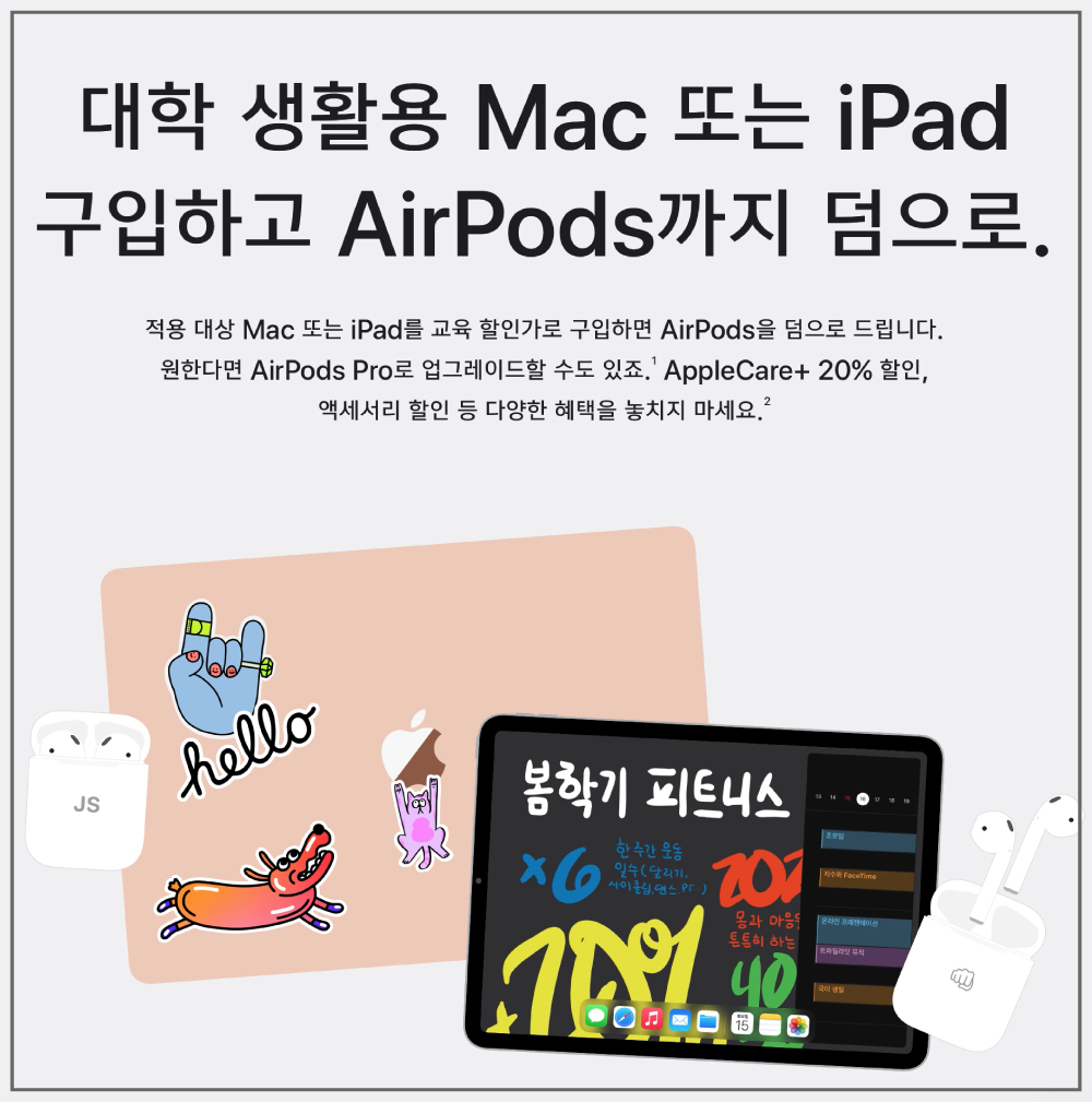 대학 생활용 Mac 또는 iPad 구입하고 AirPods까지 덤으로. 게다가 AppleCare+와 특정 액세서리 등 다양한 품목에 대한 학생 할인 혜택도 마련되어 있습니다.