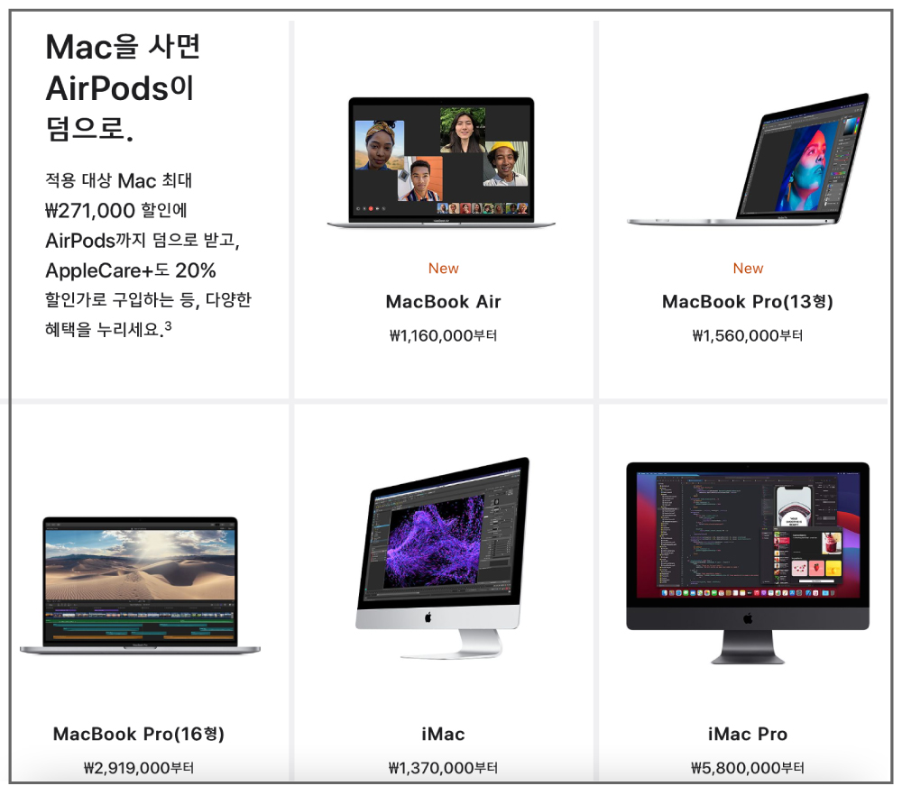 올해는 MAC또는 IPAD를 구입시 에어팟증정과 애플케어 20%할인을 해줍니다.
