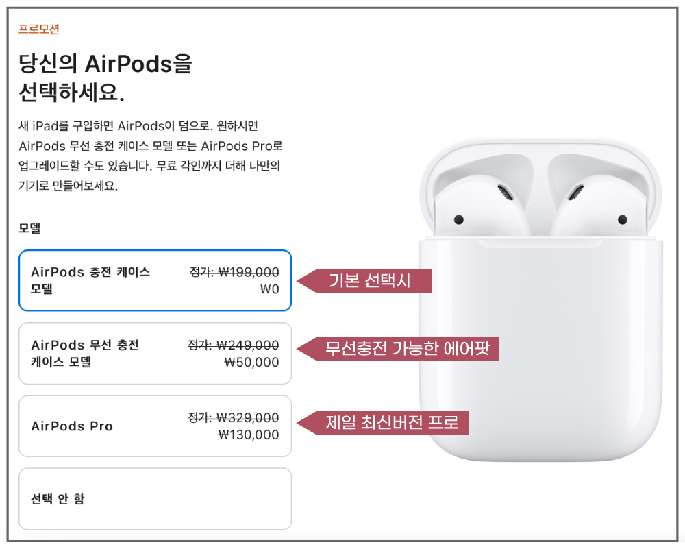 혜택 : 에어팟 증정 (+ 추가금시 pro로 업그레이드 가능), 애플케어 20%할인