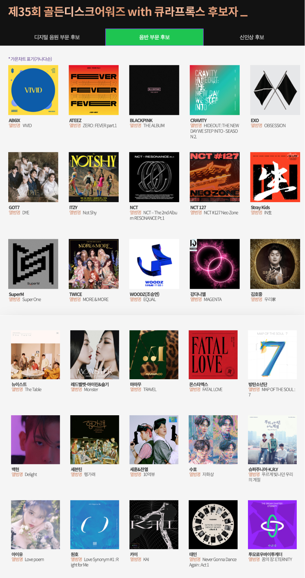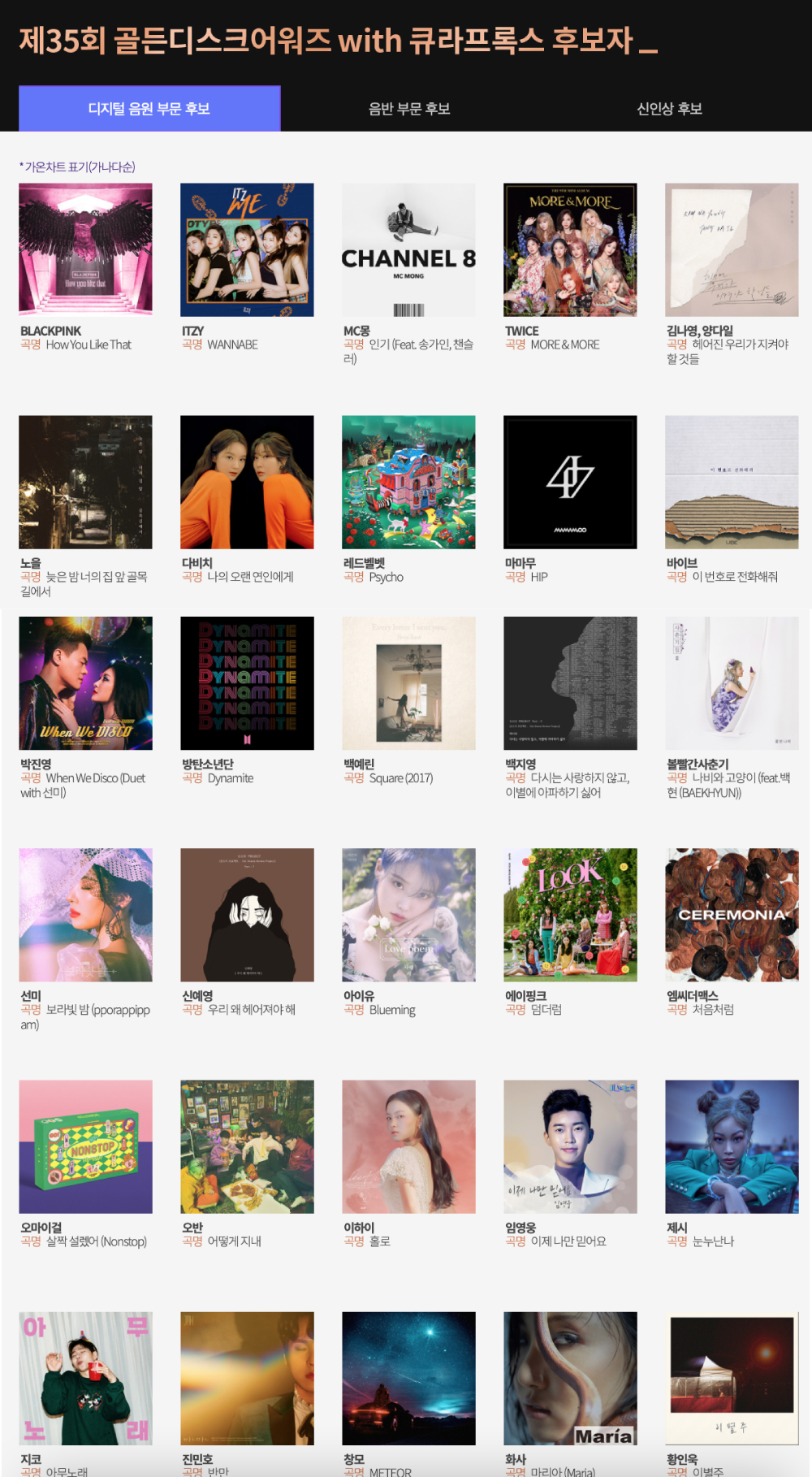디지털 음원 부문과 음반부문 후보는 아래 이미지를 참고해보세요.