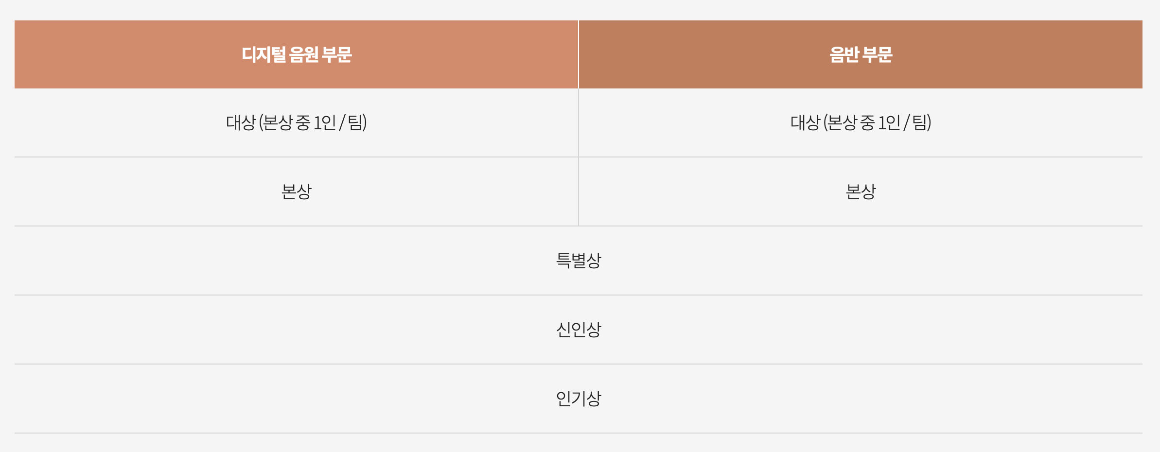 디지털 음원부문과 음반부문으로 각각 본상에 입상한 자를 상대로 대상 한 팀에게 부여됩니다.