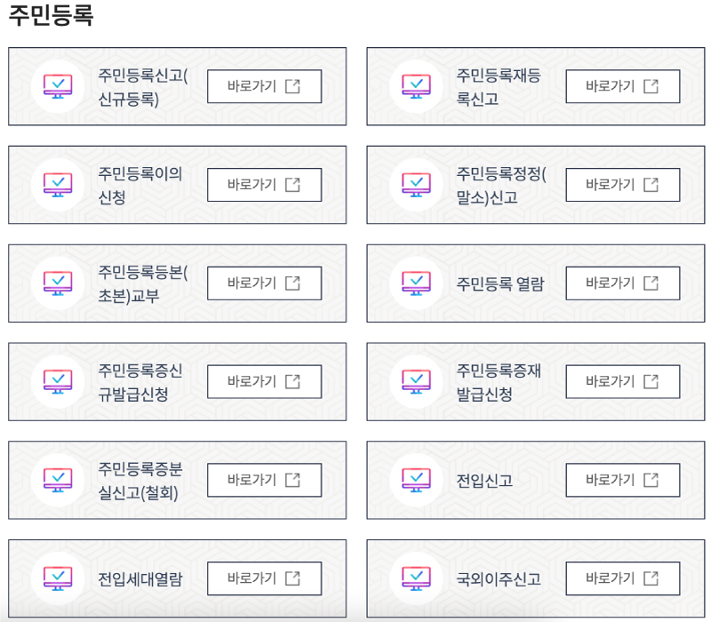 주민등록에 관련된 모든 업무를 볼 수 있습니다. 제일 많이 이용하시는 것이 주민등록 등본, 초본일 텐데요. 이것은 창구에서 서비스를 받게되면 수수료가 붙고, 온라인에서 이용하면 무료입니다.