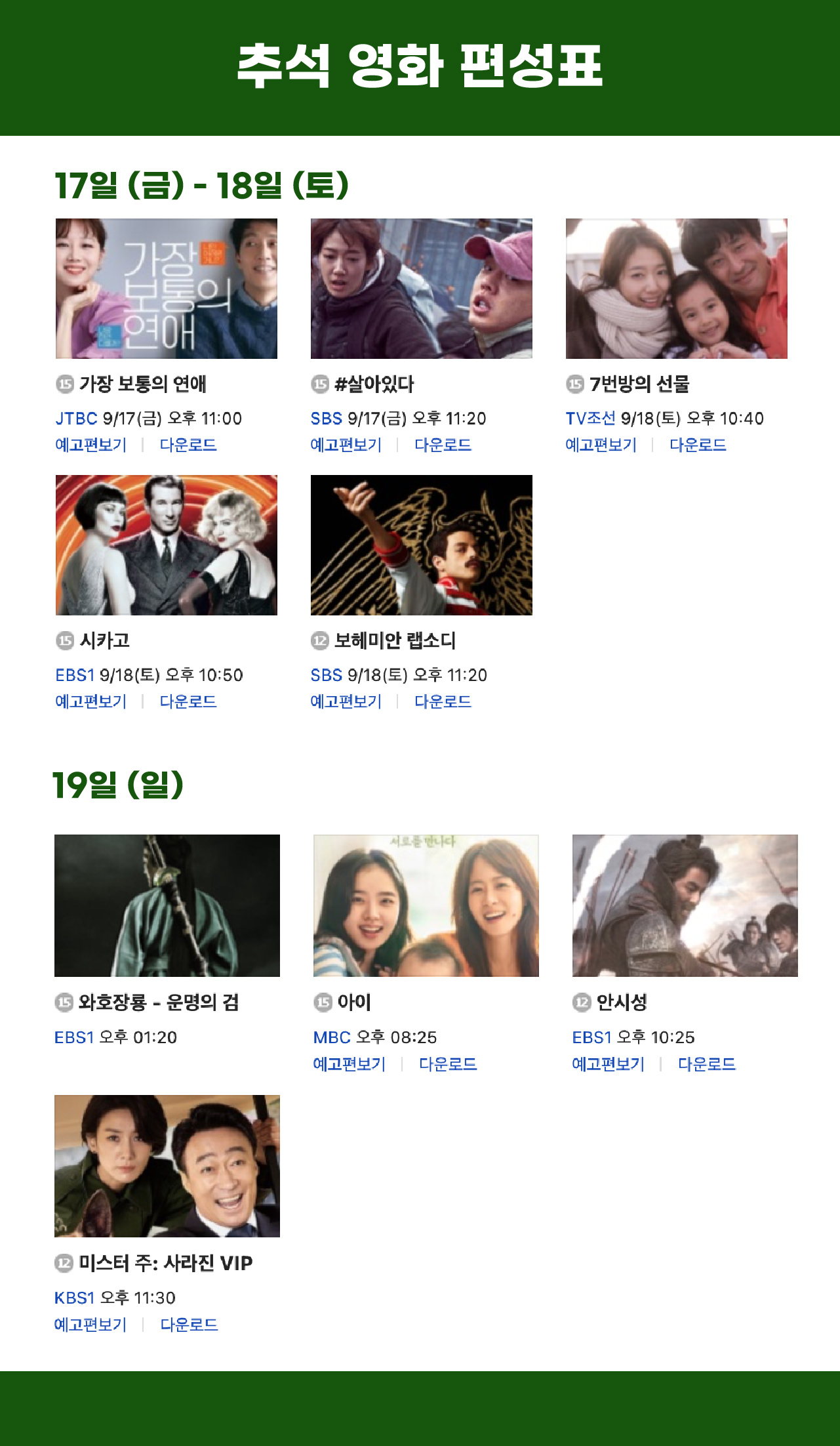 본격적으로 추석연휴가 시작되는 내일 금요일 밤 부터 예능 및 영화가 시작됩니다.