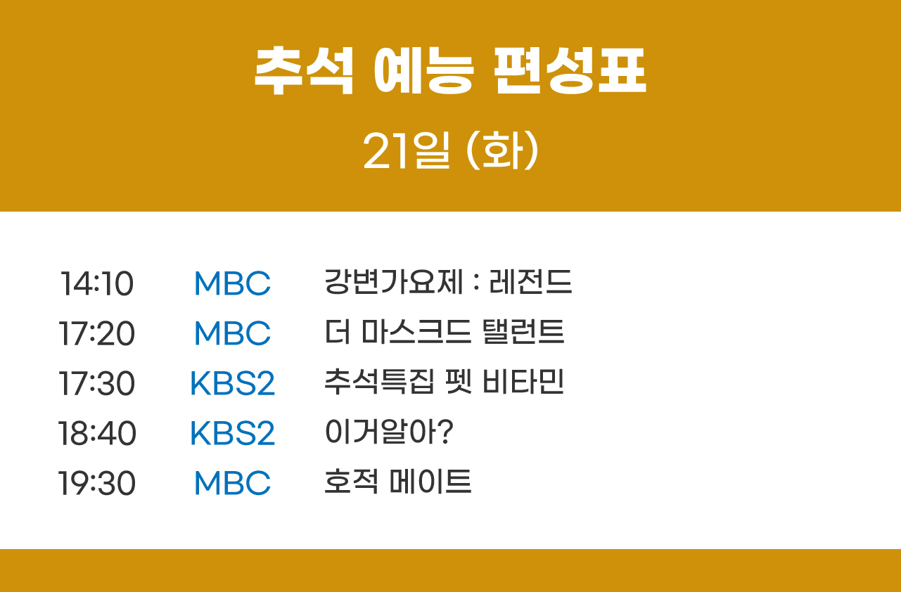 2021년 9월 21일 화요일 예능 편성표