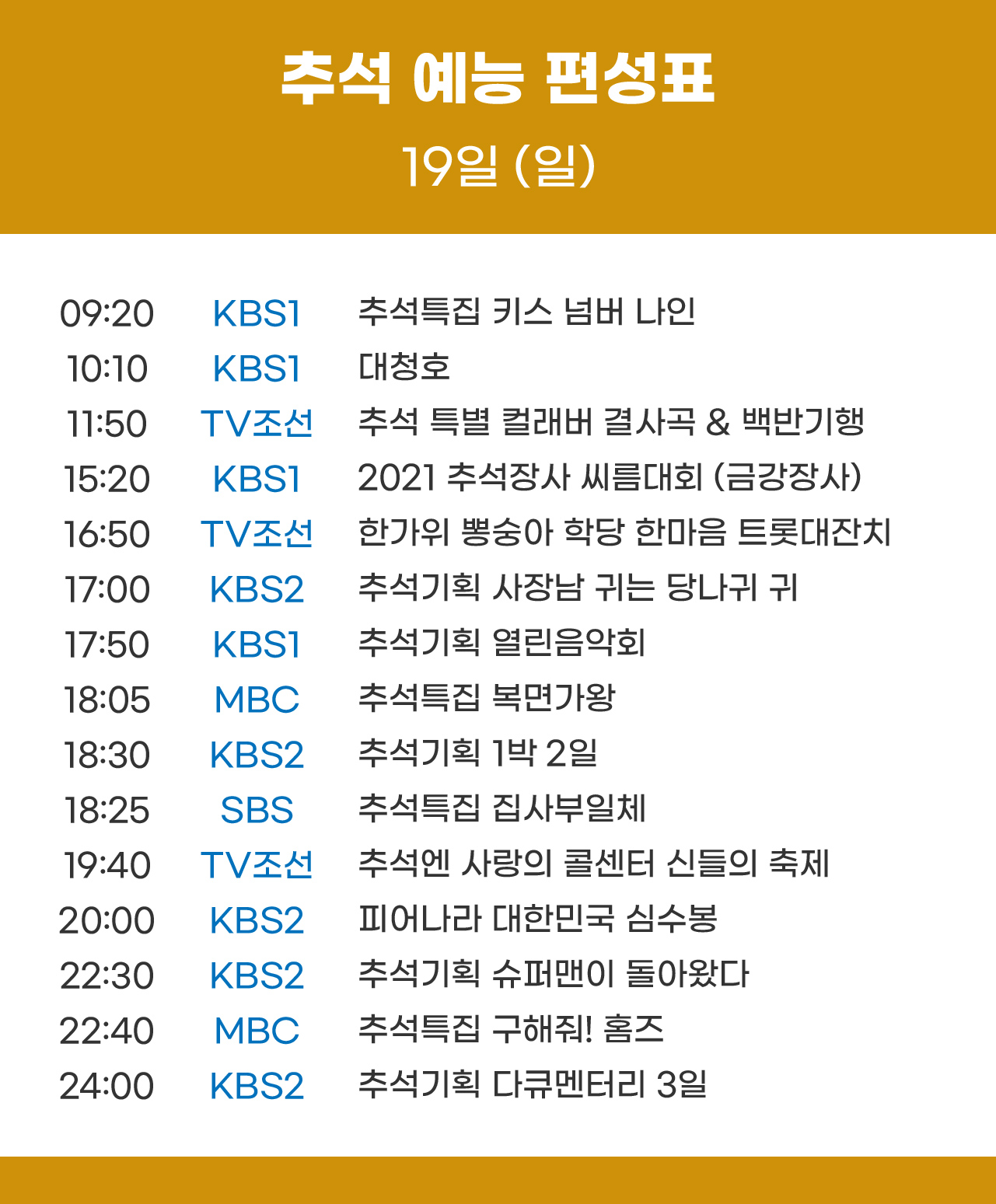 2021년 9월 19일 (일) 예능 편성표