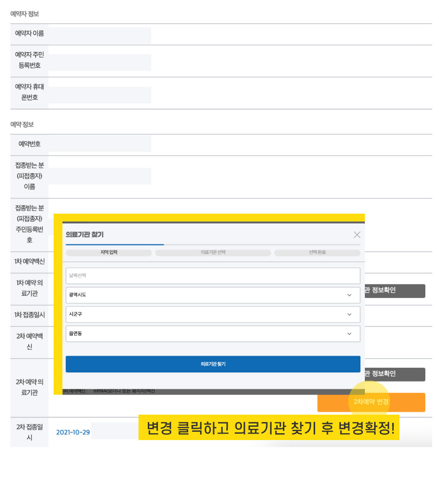 ④ 예약자 정보가 나오면 하단의 2차 예약 변경을 클릭 후 일정 및 의료기관을 선택하면 백신 접종 일정이 변경됩니다.