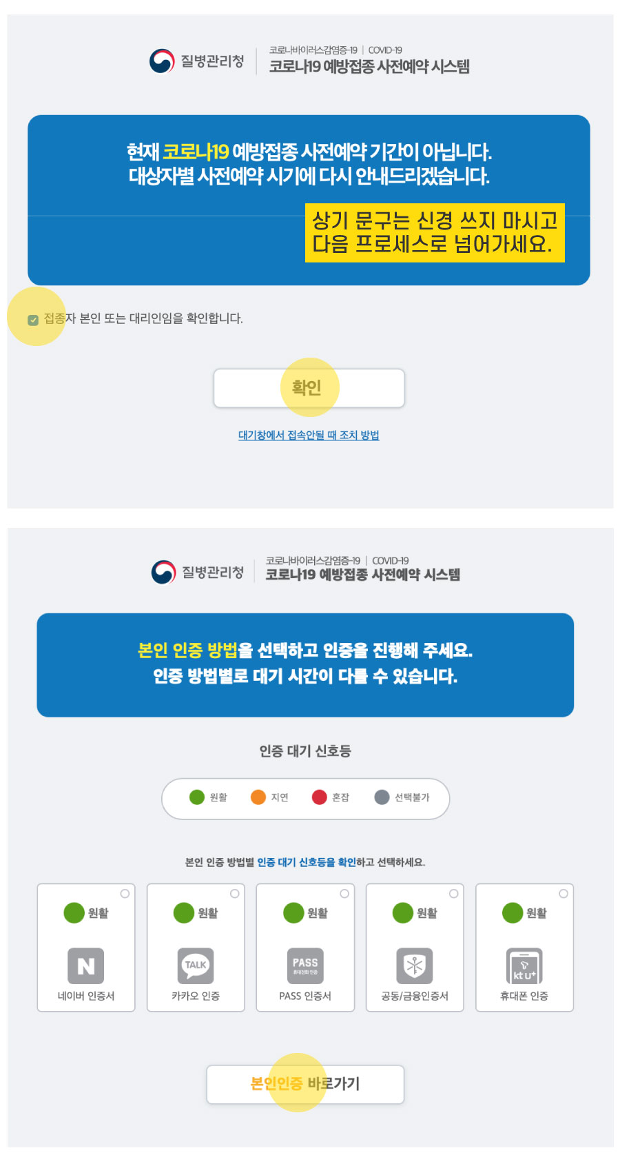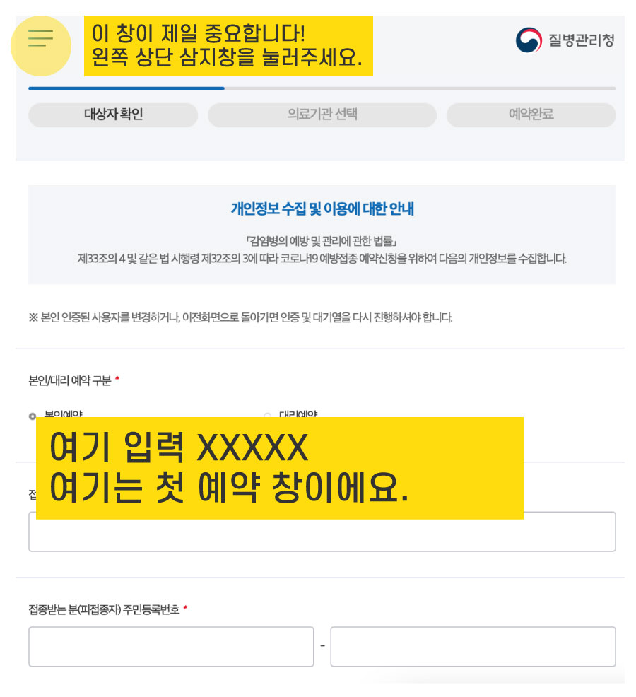 ① 위의 질병관리청 링크로 접속 후, 본인인증을 진행해 주세요.