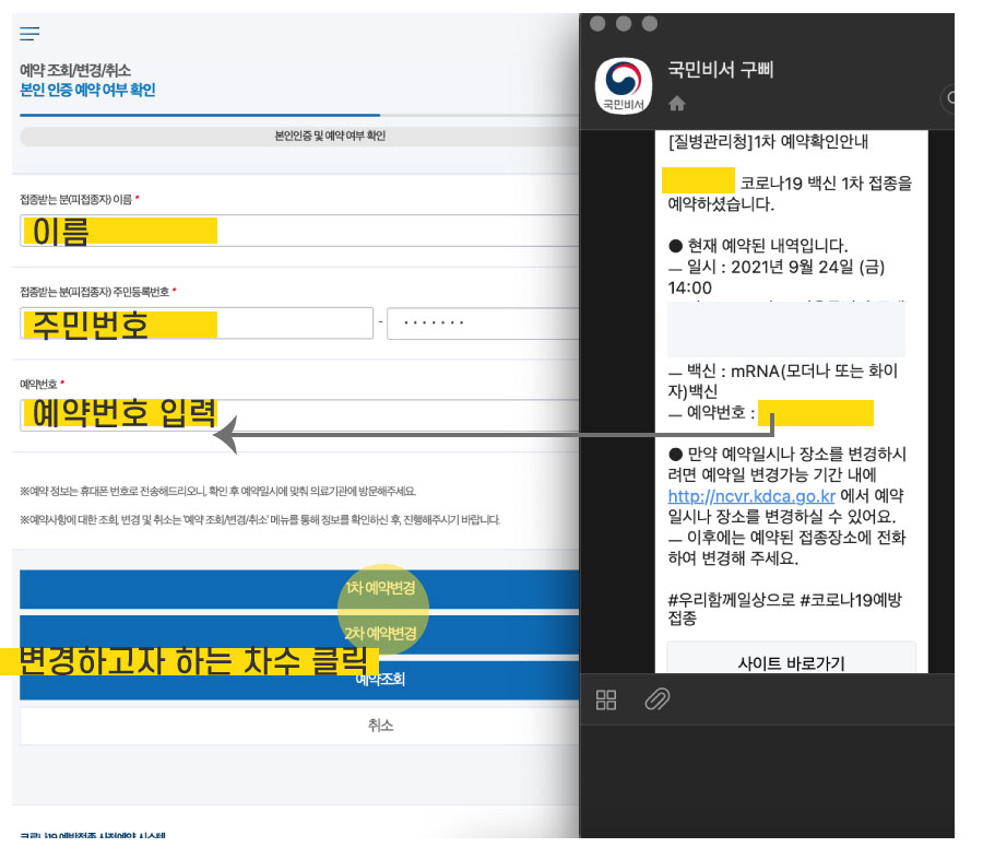 이때 꼭 필요한 것은 처음 예약 시 나온 예약번호인데요. 이건 카카오톡으로 온 기록이 있으니까 거기서 찾아서 입력하세요.