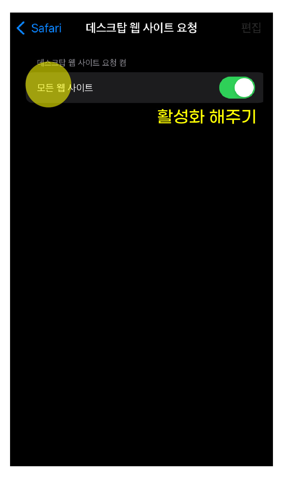 4. 데스크탑 웹사이트 요청 안에서 모든 웹사이트가 비활성화 되어있을거예요. 이걸 활성화 시켜주세요.