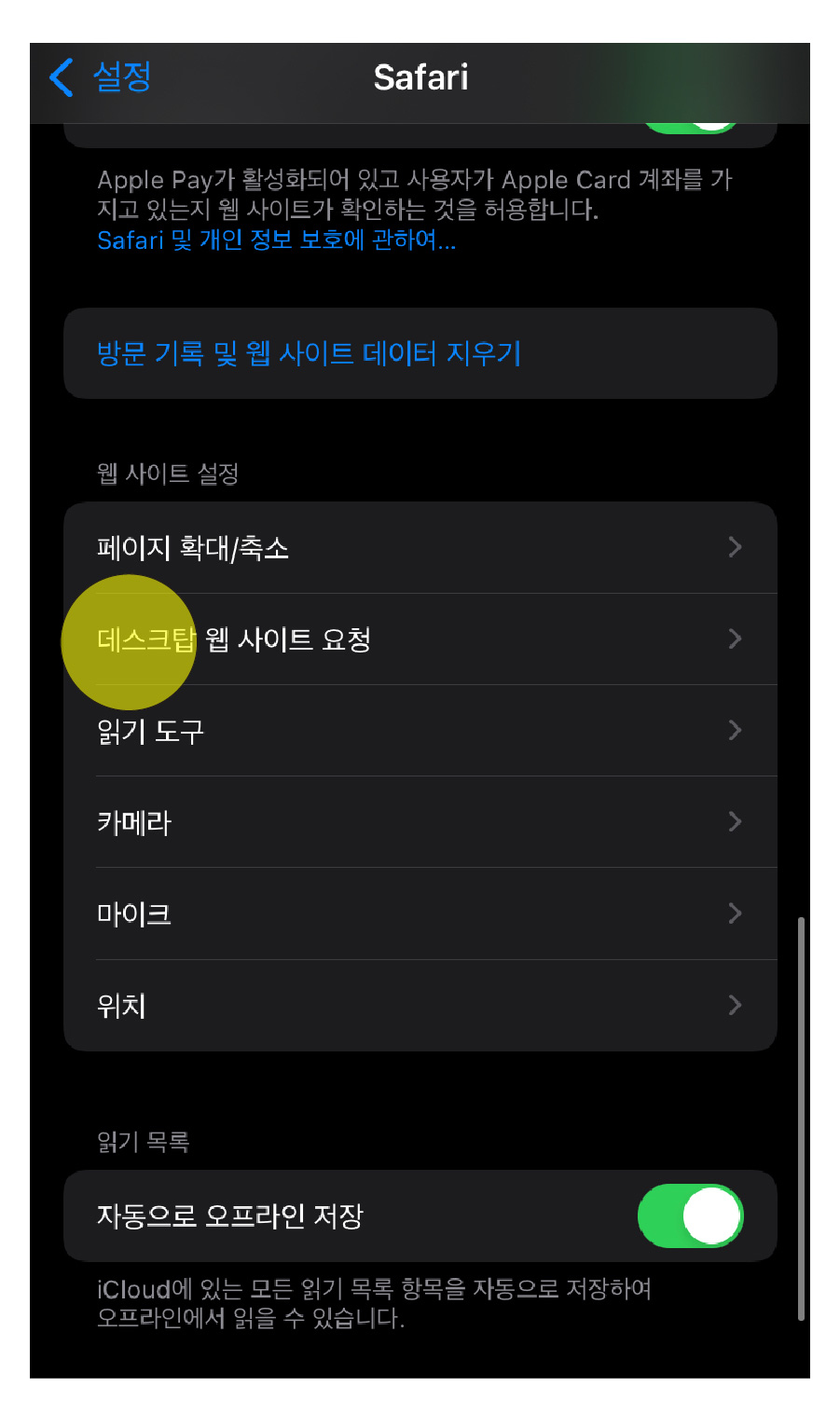 3. 하단 스크롤 내린 후 웹사이트 설정 > 데스크탑 웹 사이트 요청 으로 들어가 주세요.
