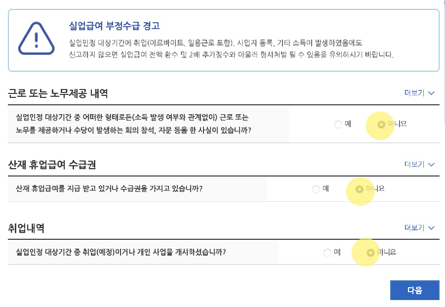아무런 부정수급이 없다면 모두 아니오에 체크하시면 됩니다.