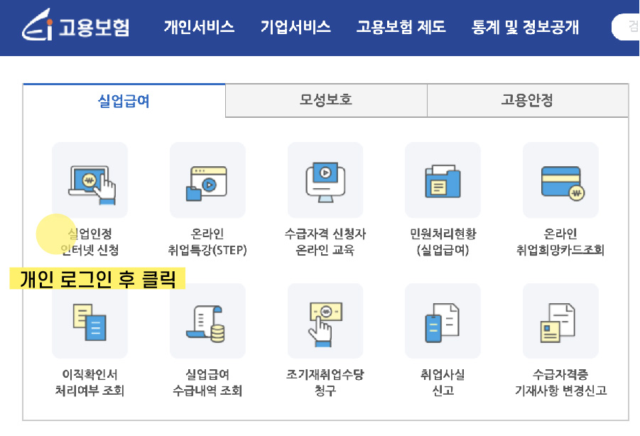 1. 고용보험 사이트에서 개인 인증방법을 선택해 로그인을 먼저 해주세요.