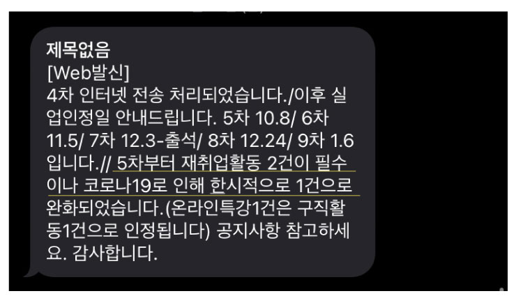 그러나 코로나19로 인해 방문이 필수가 아니게 되면서, 4차 실업인정일에 이후 일정에 대해서 문자 메세지가 오더라고요.