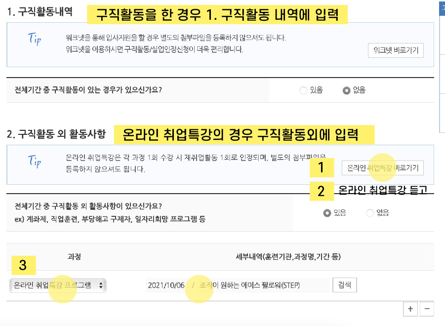 온라인 취업특강을 수강해야하는 경우 혹은 수강을 완료한경우는 2번 구직활동 외 활동사항에 있음을 체크하면됩니다.
