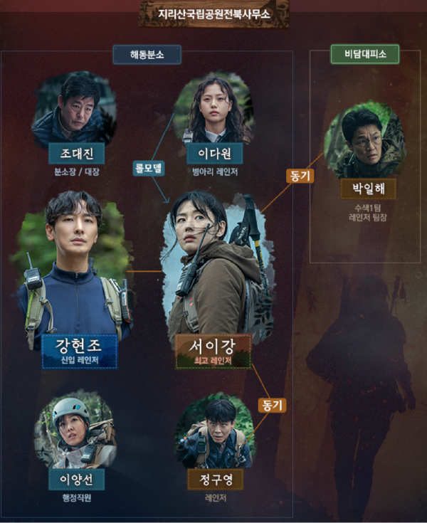 티저영상을 보니 신입 레인저 강현조(주지훈)는 육사 대위 출신으로 부하를 잃는 사고를 당한 후 지리산에서 죽음을 당하는 사람들이 보여 레인저가 된거 같습니다.
