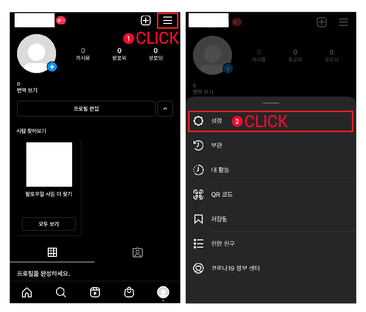 1. 계정 메인 페이지 우측 상단의 삼지창 클릭 후 설정으로 들어갑니다.