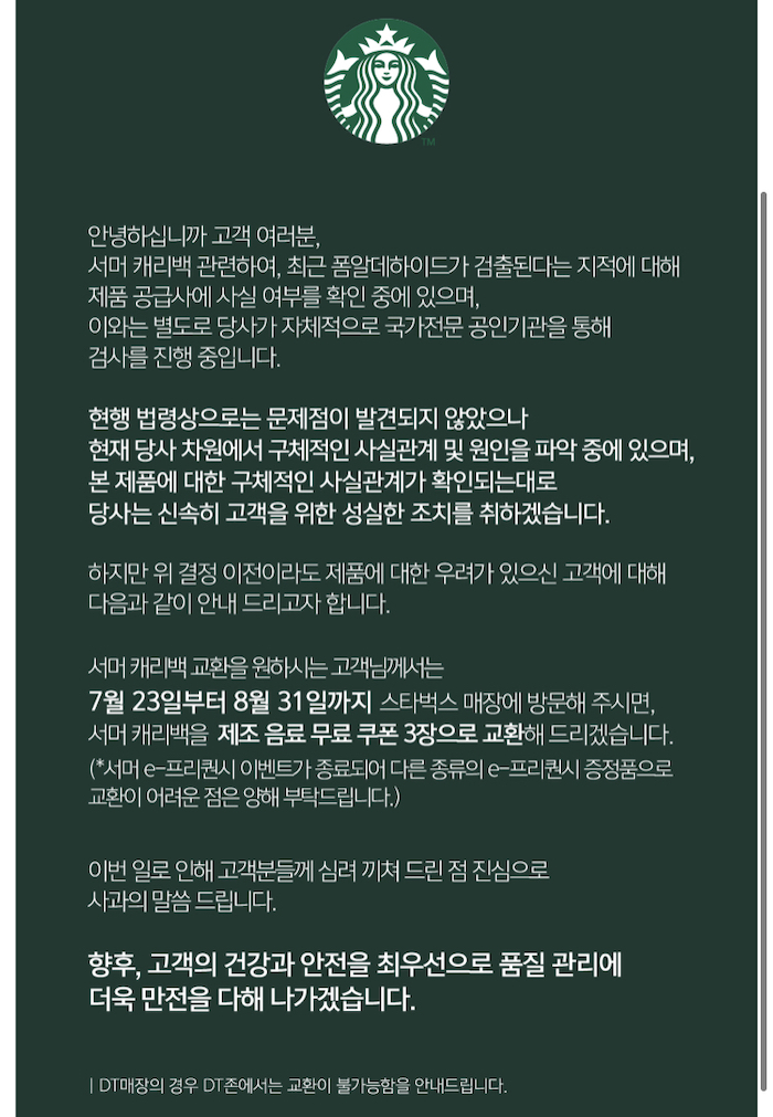스타벅스 측에서는 아직 공식적인 결과가 나오지 않았으나 선제적 조치로 음료 무료 쿠폰 3장으로 교환 처리를 해준다고 합니다.