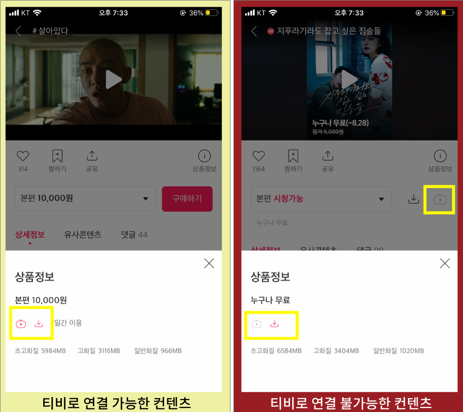 당연히 모든 콘텐츠는 티비에 연결이 가능할 줄 알고, 포인트를 사용했던 영화를 보지 못한 적이 있습니다. 바로... 티비연결이 안되는 컨텐츠도 있습니다. 꼭 재생 전 티비 모양이 활성화되어있는지 확인해서 불이익이 없으시길 바랍니다.