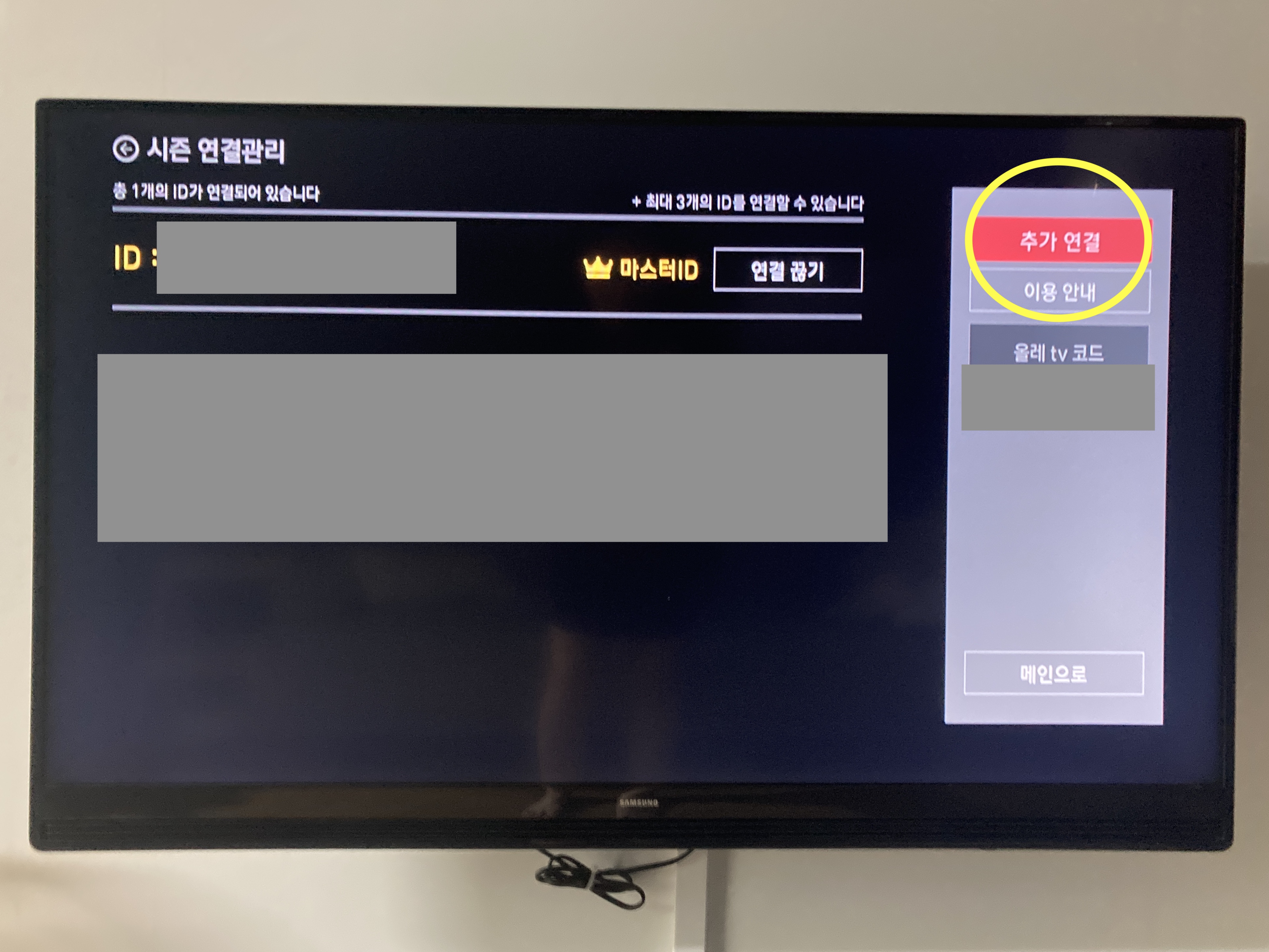 아까 들어갔던 티비의 채널에서 추가 연결을 눌러주세요. 저는 기존에 두 개가 연결되어있었는데, 처음이신 분들은 아마 아무것도 없이 연결하는 페이지가 있을 거예요.