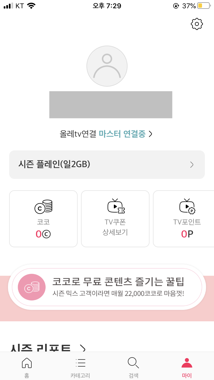 시즌 어플> 마이페이지에서 티비와 연결해줍니다. 올레 TV 마스터 연결 중이라는 버튼을 클릭해주세요. 저 부분은 상황에 따라 다를 수 있는데 클릭해서 들어가시면 됩니다.