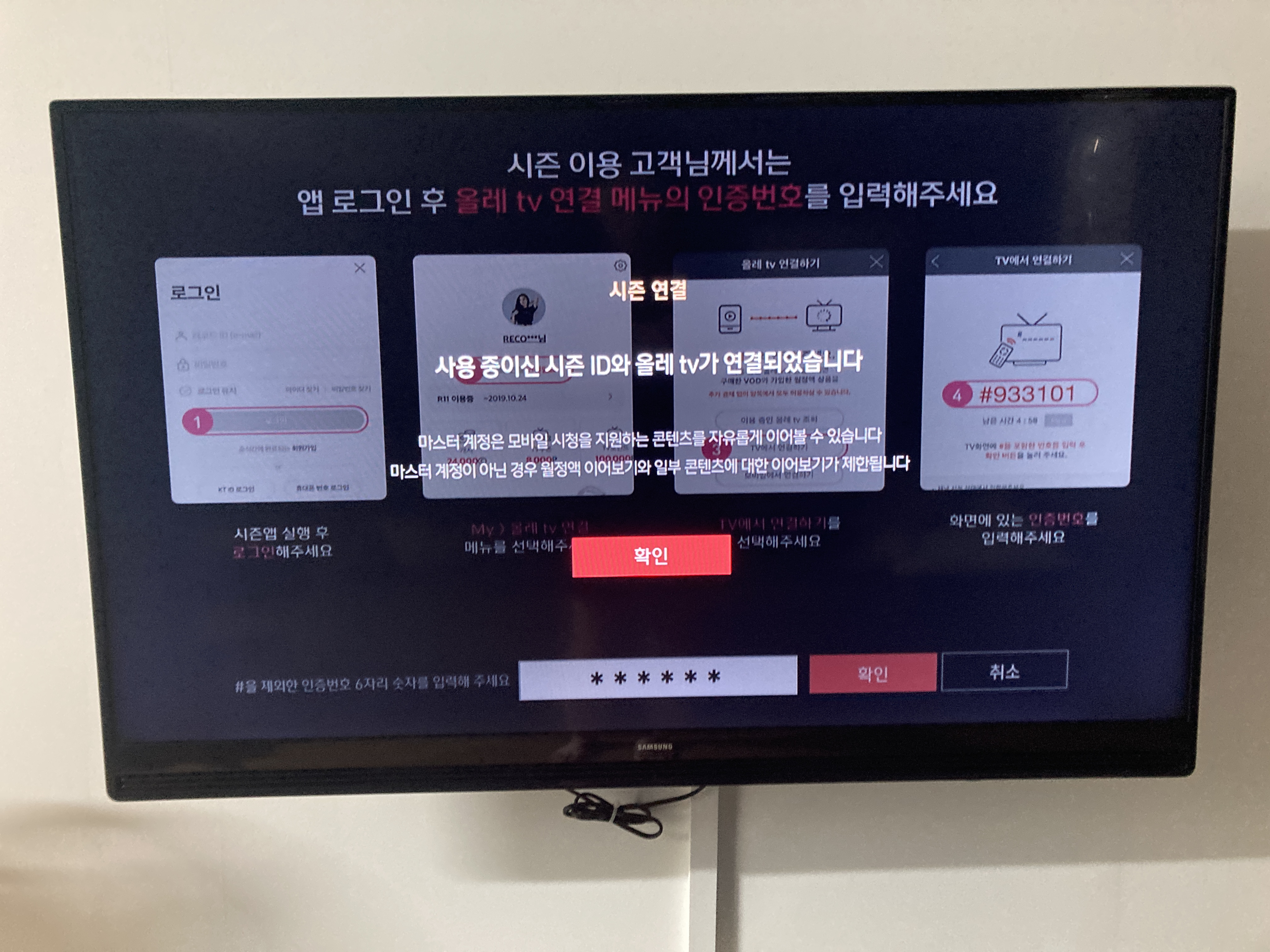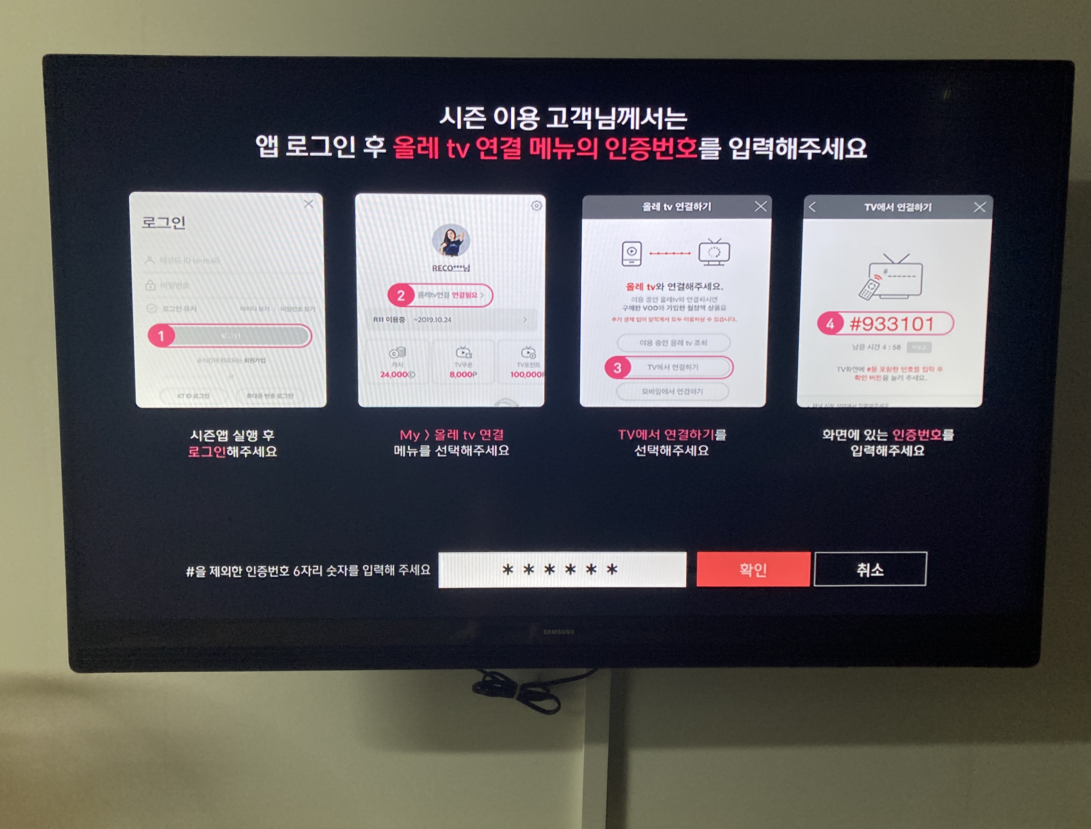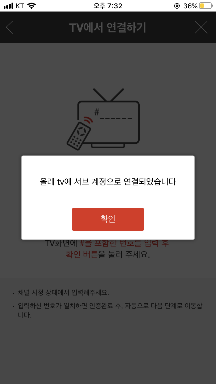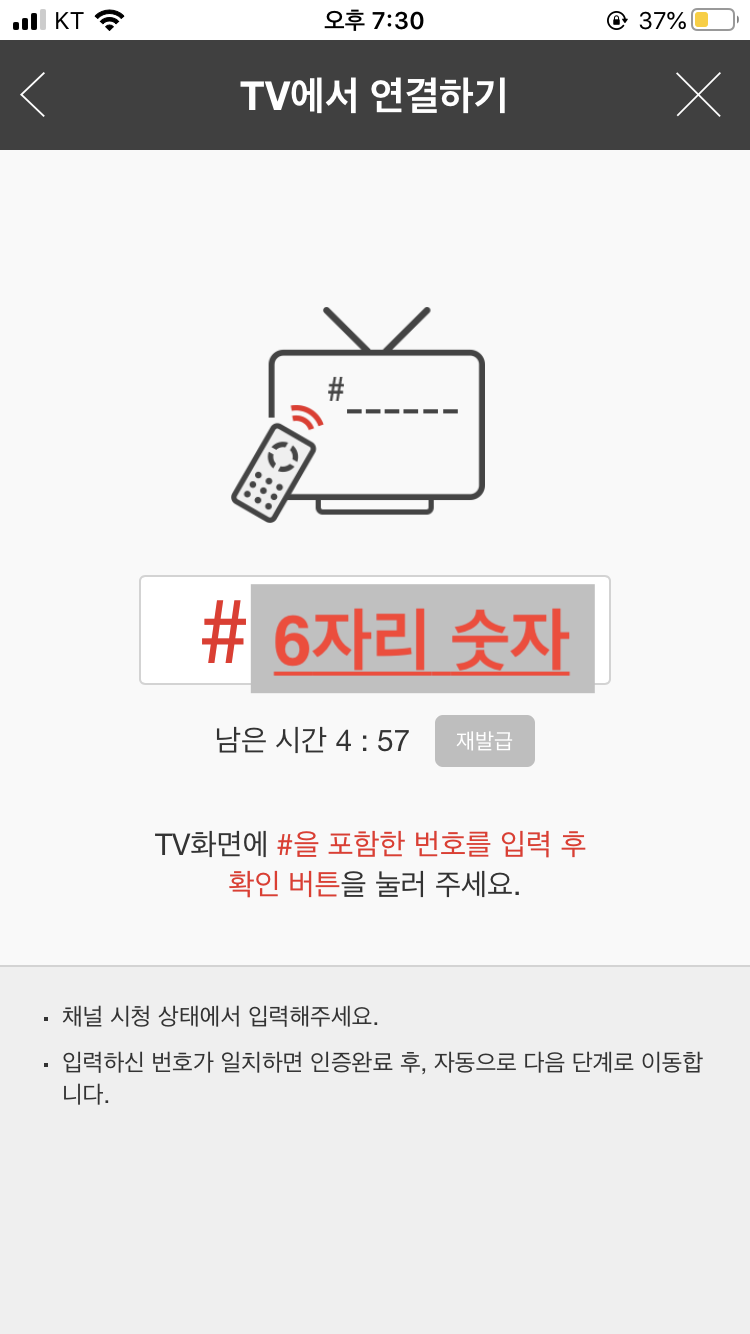 티비로 연결하기를 누르면 6자리 숫자가 나오는데, 이걸 티비에 입력해 줄거예요.