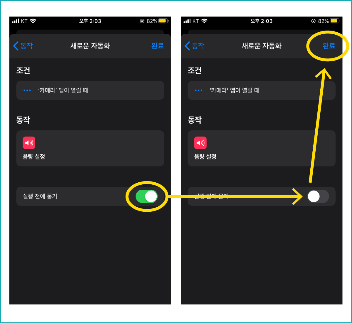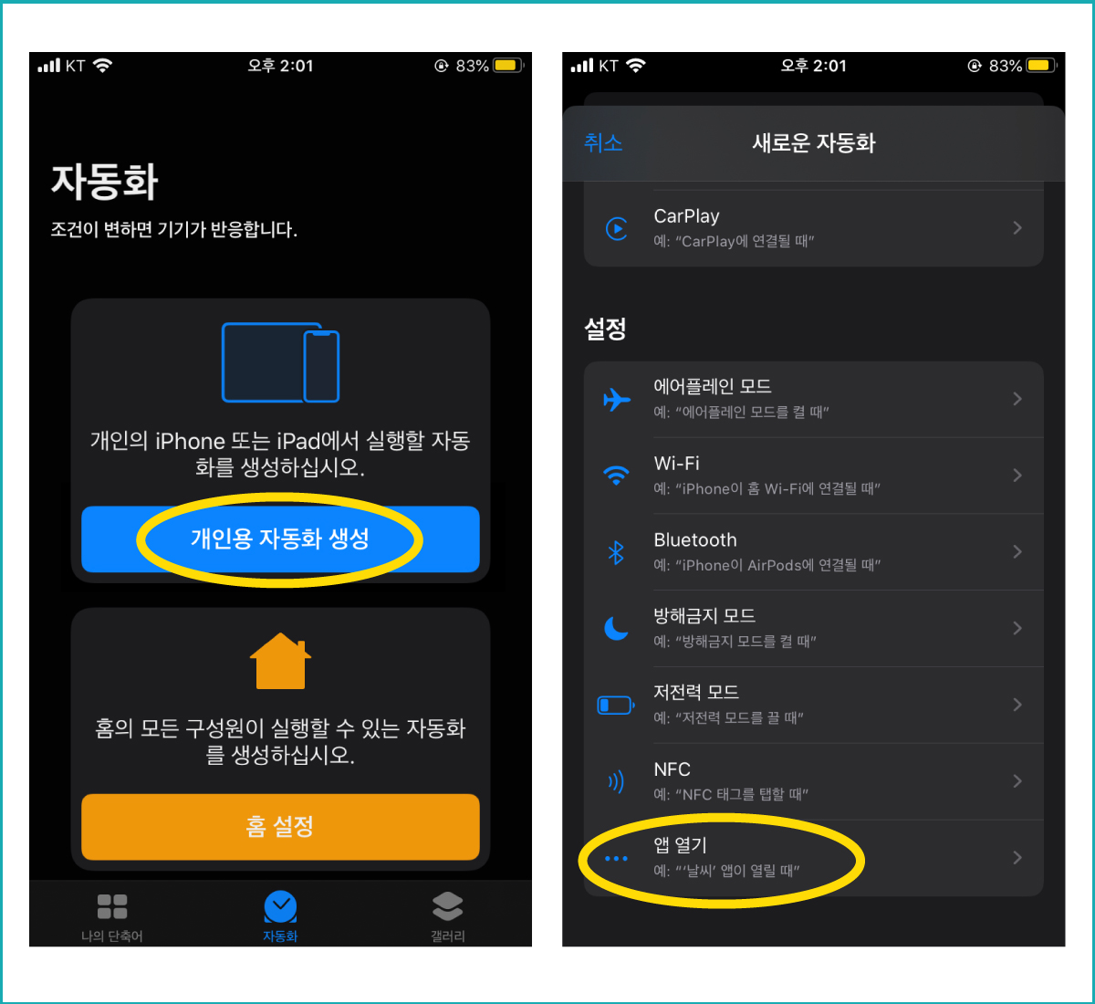 개인용 자동화 생성을 누른 후, 제일 하단의 앱 열기 설정에 들어가 주세요.