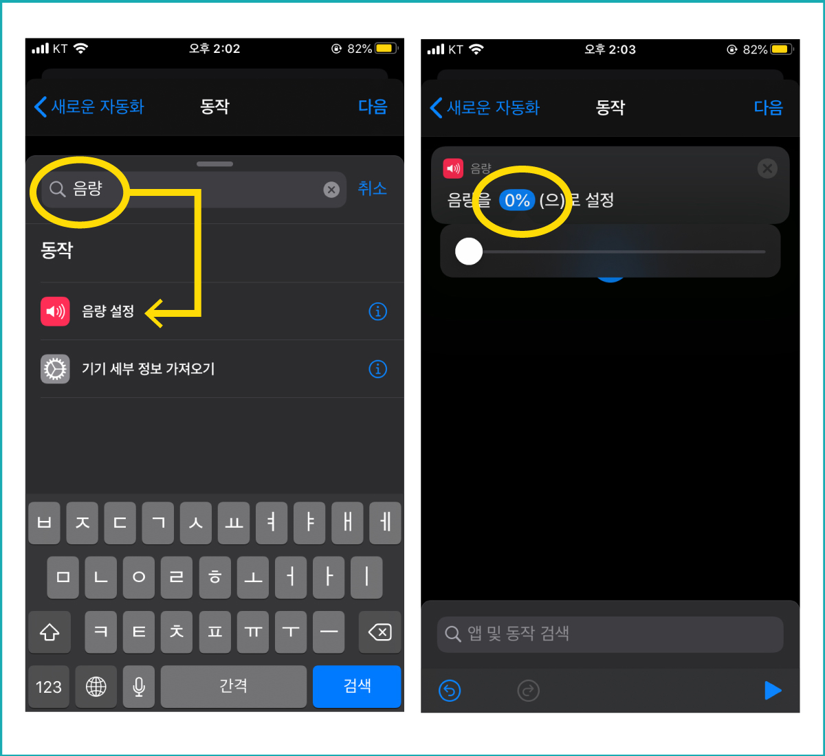 ■ 동작추가를 눌러서 음량을 검색하여 음량 설정에 들어간 후