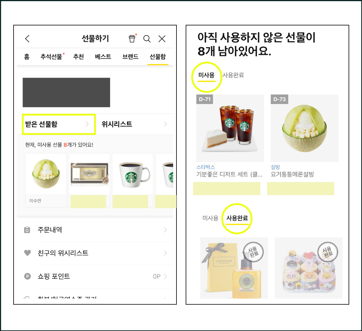 받은 선물함을 눌러서 들어가시면 미사용 / 사용완료 두가지로 나눠서 확인이 가능합니다.