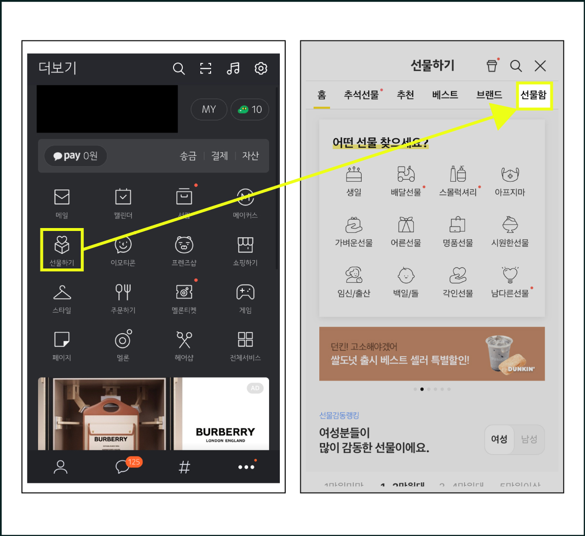 우측 카테고리 바에 선물함을 눌러서 들어가주세요.