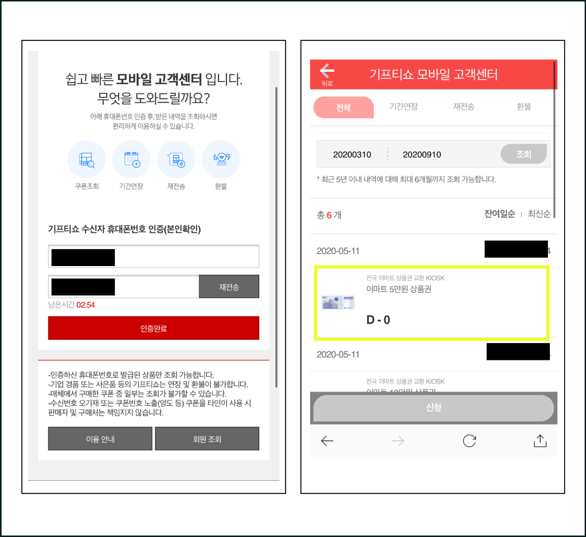 -인증하신 휴대폰번호로 발급된 상품만 조회 가능합니다. -기업 경품 또는 사은품 등의 기프티쇼는 연장 및 환불이 불가합니다. -매체에서 구매한 쿠폰 중 일부는 조회가 불가할 수 있습니다. -��